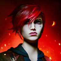 red hair and a red and black outfit, which includes armor and what appears to be a flame-themed design on her shoulders. Behind her, there are flames adding to the intense appearance of the character.