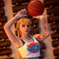 a basketball uniform with the words "Looney Tunes" on it, and holding a basketball. The individual is striking a pose that mimics the style of poses seen in stylized animation or