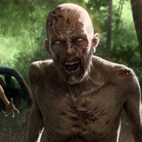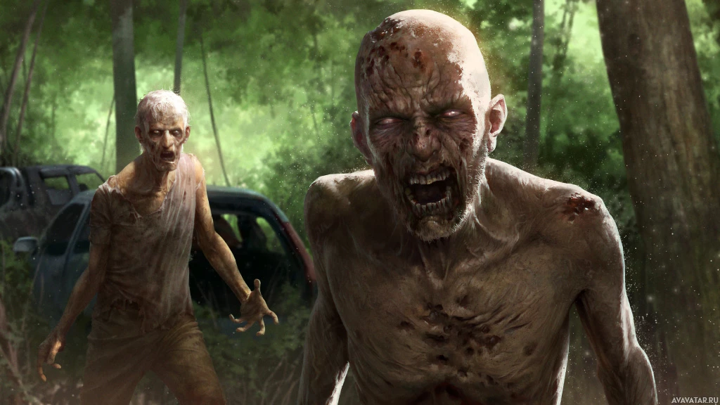 a video game or movie that appears to be set in a post-apocalyptic or survivalist environment. There are two characters, one on the left and one on the right. Both characters appear to be infected with a zombie-like virus, as evidenced by their