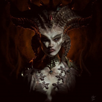 The image depicts a fantasy-themed character, possibly from the game "Diablo." The character is shown with a demonic appearance, featuring horned ears and