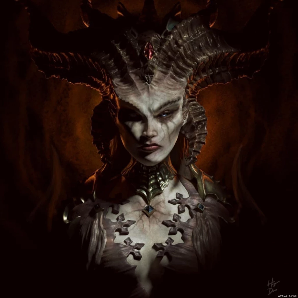 intricate armor and jewelry that give off a dark fantasy vibe. In the background, there's a hint of a fiery or demonic presence, reinforcing the theme.