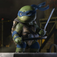 The image features an animated character known as Leonardo from the Teenage Mutant Ninja Turtles franchise. He is depicted holding a sword, wearing a mask and has his arms raised in a defensive stance. The background suggests an urban setting with various elements indicative of a street environment.
