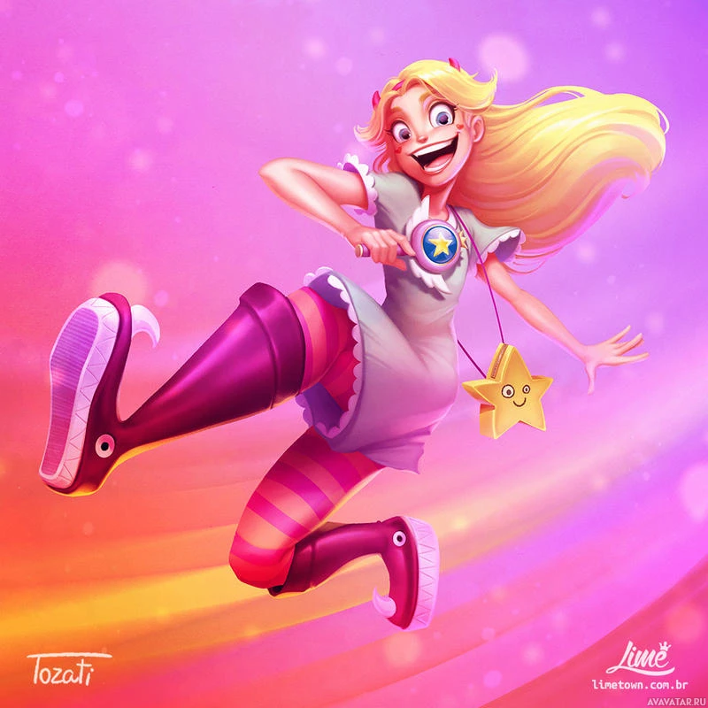 a happy expression on her face and is holding a star-shaped object in her right hand. Her legs are playfully raised in the air, and she seems to be enjoying herself as if floating or flying. The background is colorful with