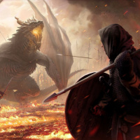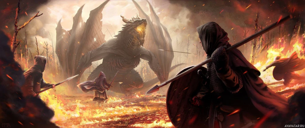 a large dragon with flames around it, creating an intense atmosphere. The setting appears to be battle-scarred ground, possibly from
