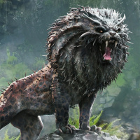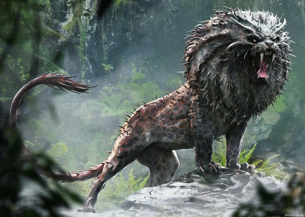 a fantasy scene featuring a creature that resembles a lion with a distinctive appearance. The creature has a combination of features not typically seen on lions, such as spiky fur and what appears to be armor or