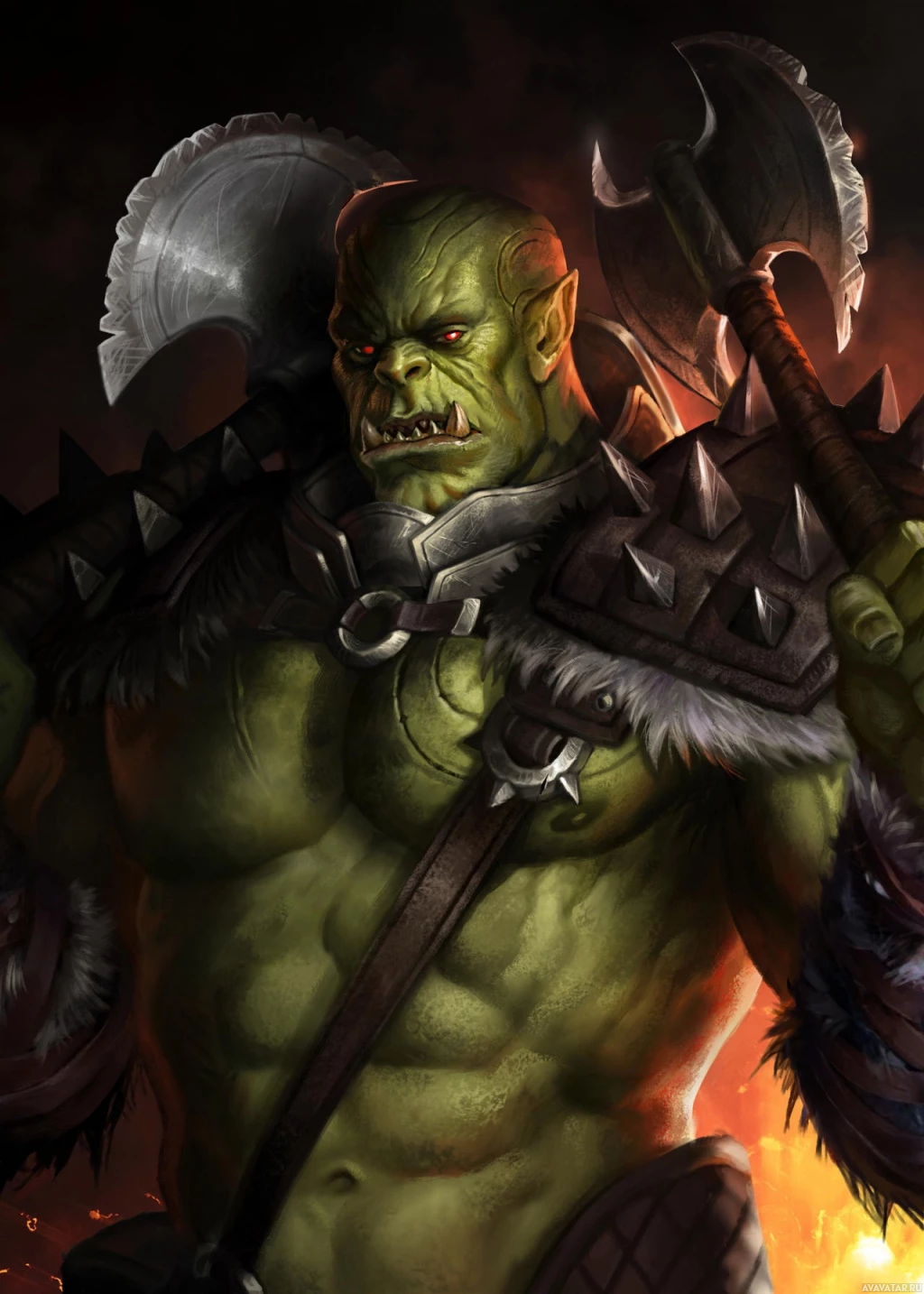 a fantasy world where these orcs are known for their strength and combat abilities. The artwork is rich in detail, highlighting the creature's muscular build,