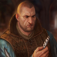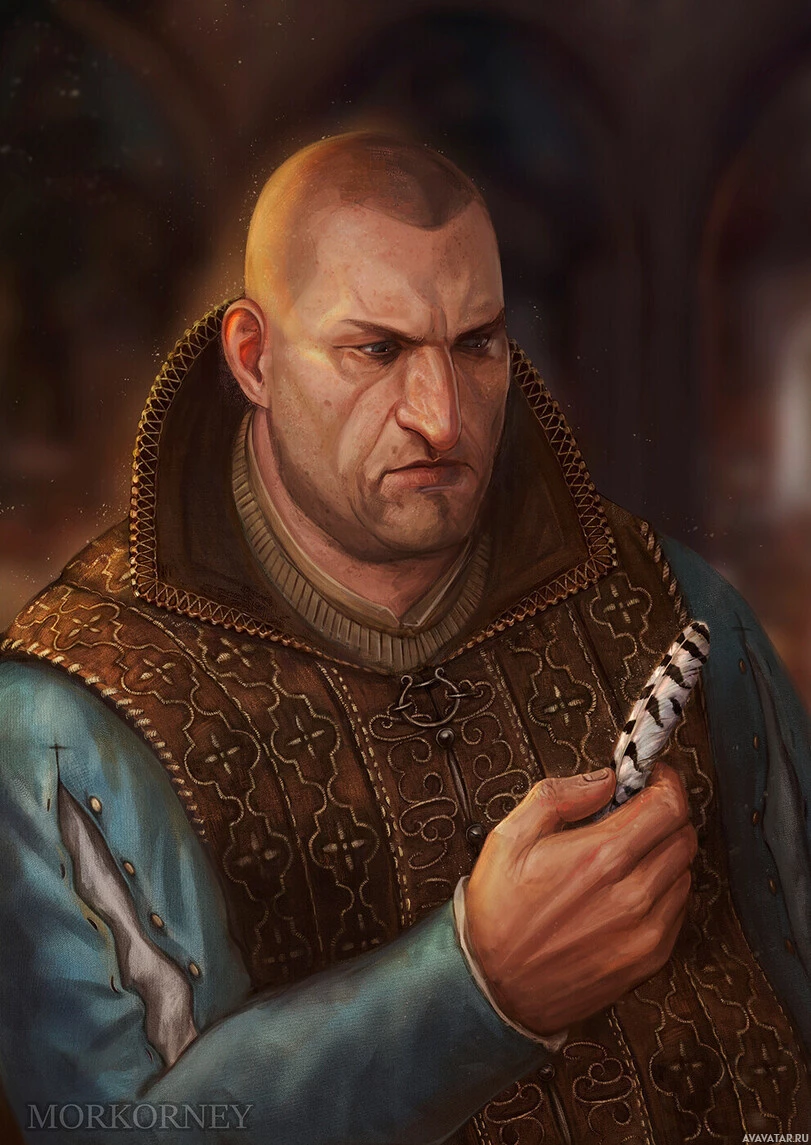 distinctive hairstyle and armor, which suggests he might be an alchemist or someone involved in magic or potion-making within the game's universe. The background is dark with a hint of fire, indicating that this could be taking place in a tavern or a place where such characters gather. There are no feathers visible in this picture.