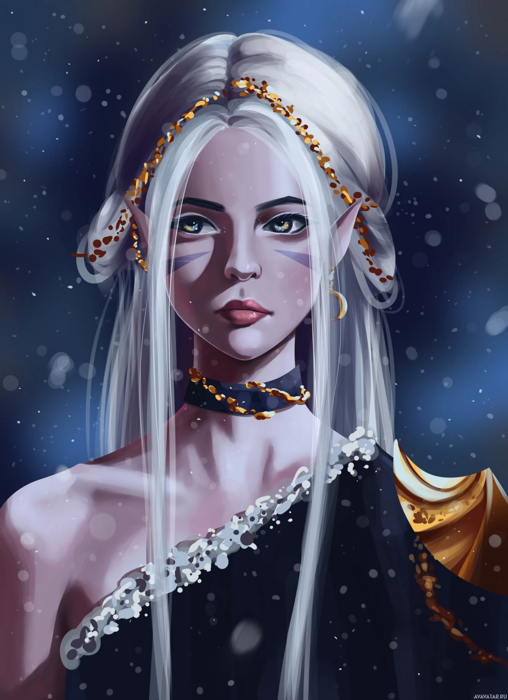 The image depicts a fantasy-themed character who appears to be an elf with long