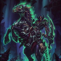 glowing eyes. It is being ridden by a humanoid figure who seems to have