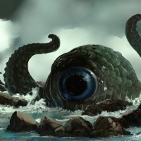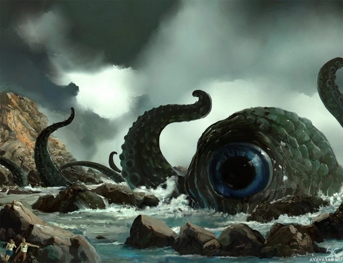 a fantastical scene of several large octopi on rocks in the foreground. One of these octopi has a prominent human-like eye, suggesting it may be a creature or a being with unusual characteristics. In the background, there is