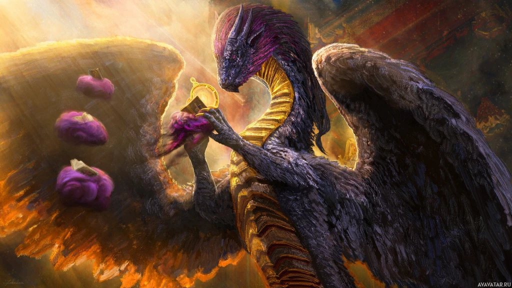 a serpentine body with scales in shades of purple, blue, and white. It is holding what appears to be an orb or crystal in its claw. In the background, there's a fiery environment suggesting that this could be a scene from