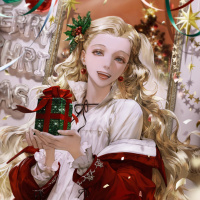 blonde hair. She is wearing Christmas-themed clothing, which includes