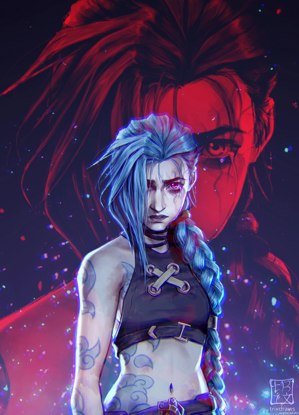 blue hair and a tattoo on her face, who is also wearing what appears to be some kind of armor or outfit with a cross design on it. On the right side, another character is depicted, this one has