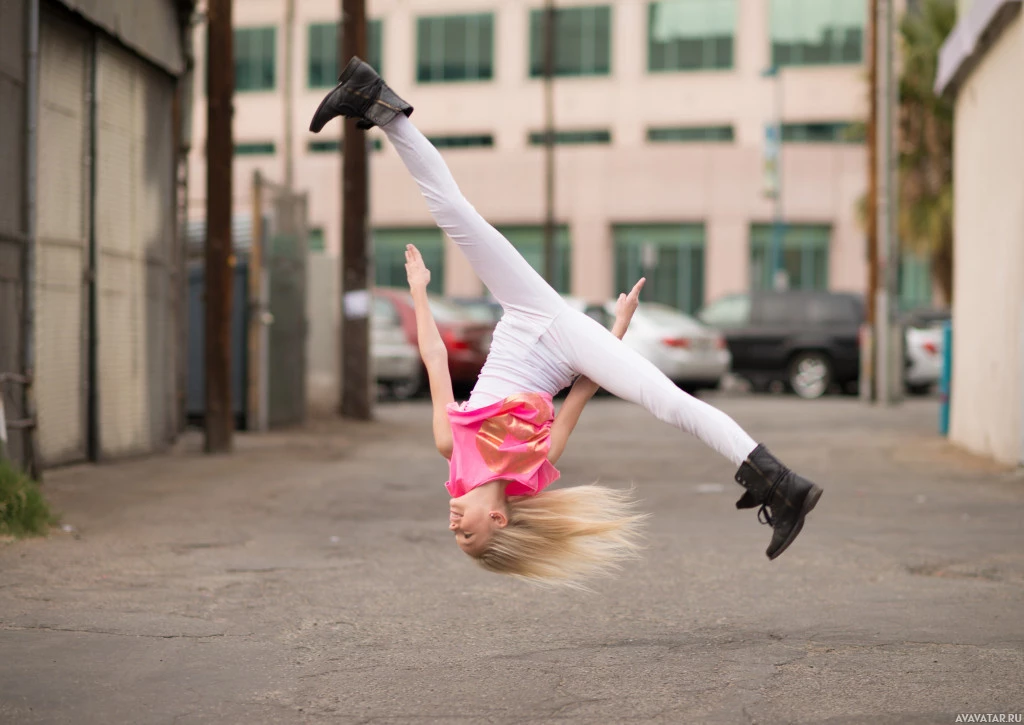 a handstand on the ground. This individual appears to be in motion, possibly dancing or moving energetically with their hands lifted off the ground and their body inverted. They are wearing