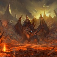 a fantasy scene with a fiery landscape. Dominating the center of the composition is