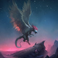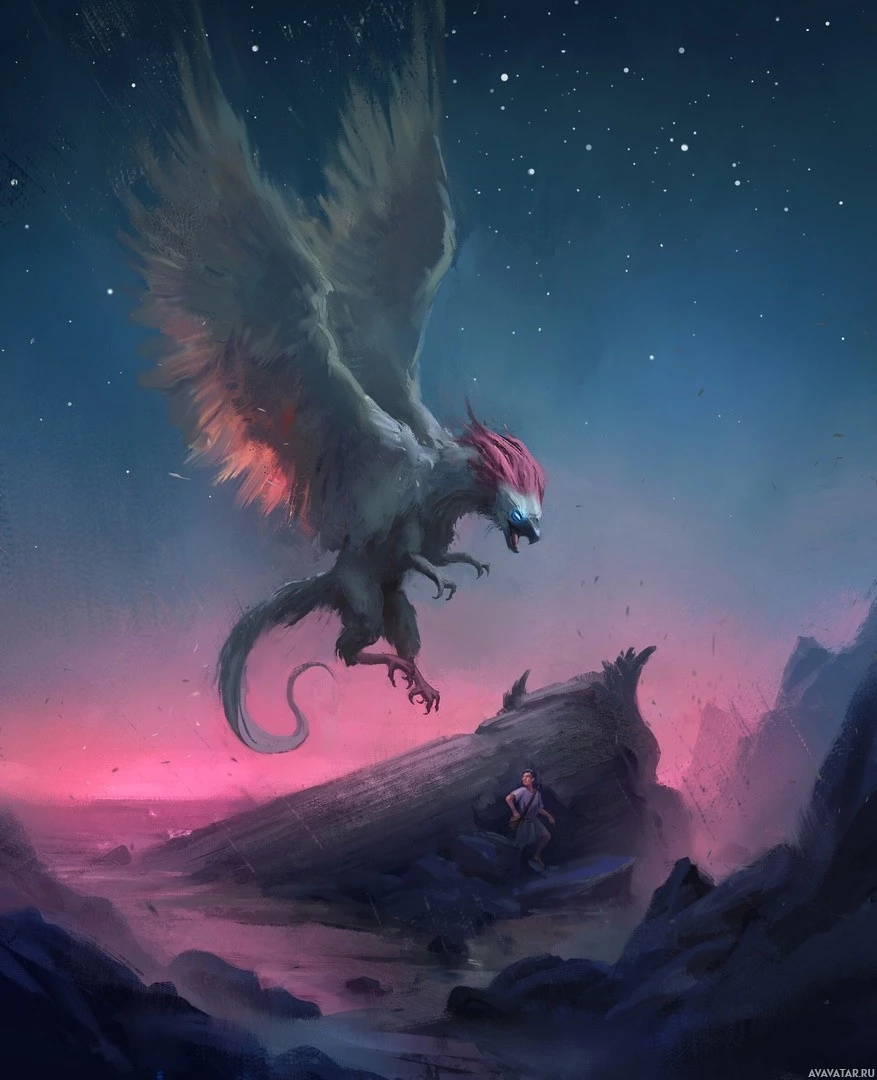 a fantasy scene featuring a griffon. The griffon, with its wings spread wide and