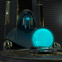 blue light and seems to be engaged in an activity that involves the use of the orb, possibly a form of energy or a magical artifact within this context. The environment suggests a high-tech or futuristic theme.