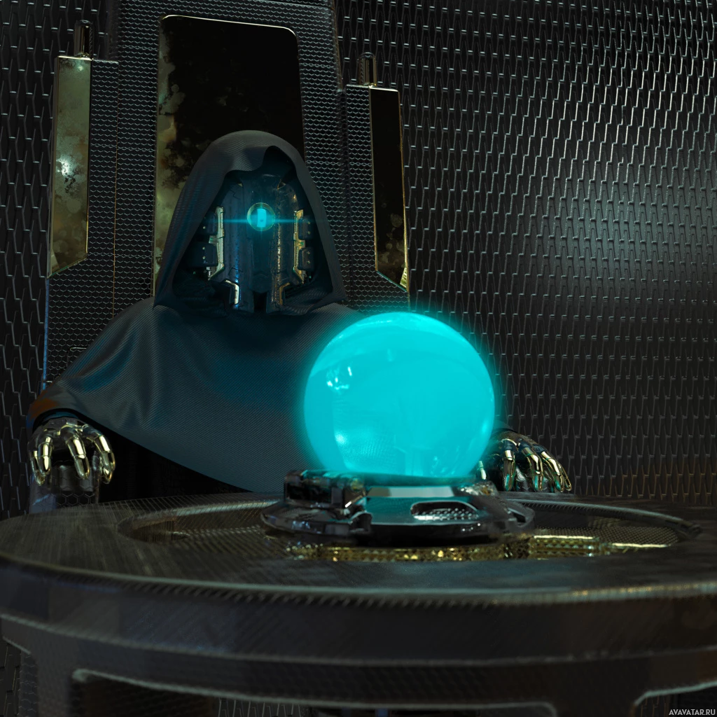 The image depicts a figure that appears to be a robot dressed in a hooded robe, reminiscent of