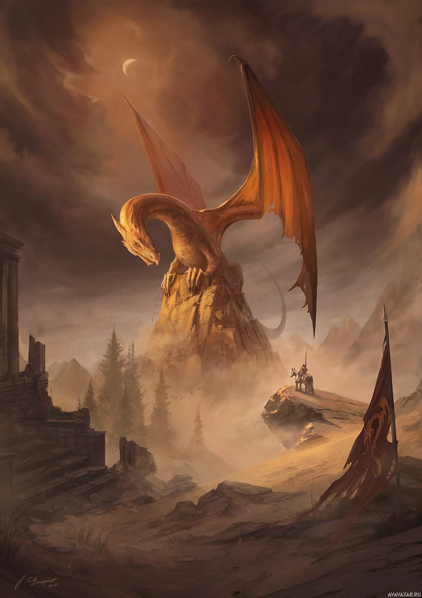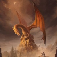 a fantasy scene featuring a dragon. The dragon is perched atop