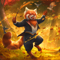 a human magician or wizard, complete with a costume and a wand in hand. The character appears to be standing amidst an autumnal forest setting with leaves scattered around, and there are