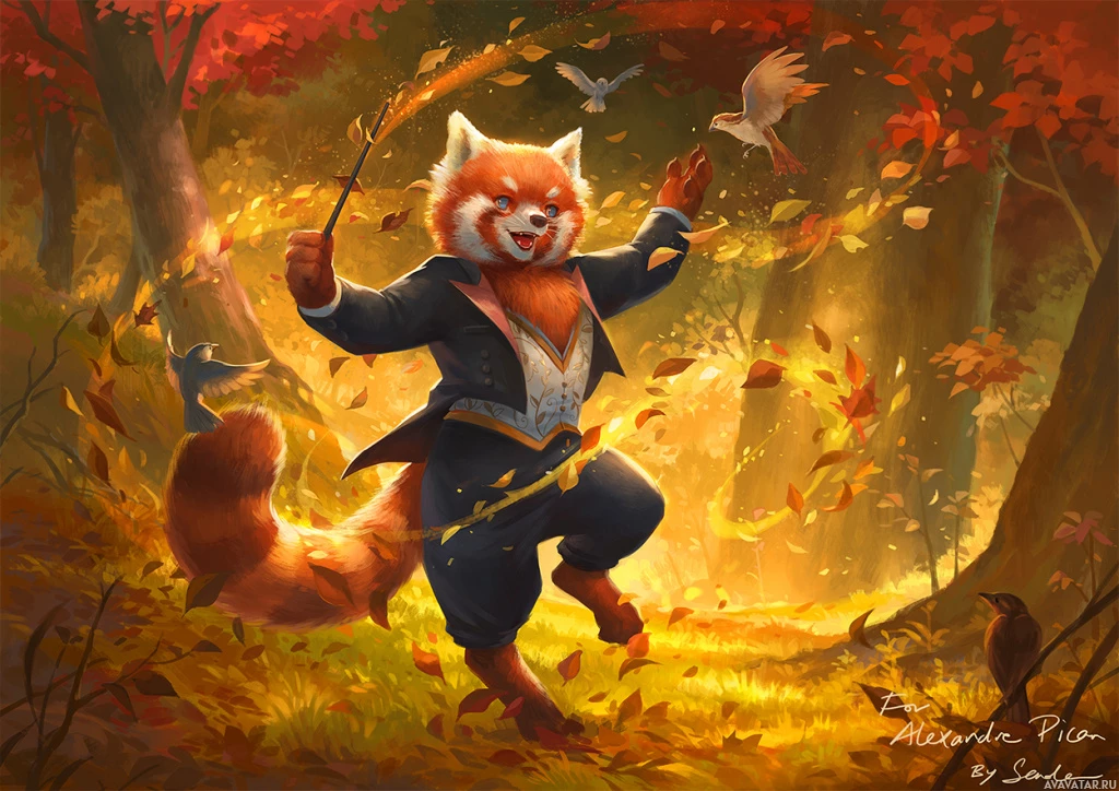 a red panda, an animal known for its distinctive reddish-orange fur. In this illustration, the red panda is anthropomorphized and dressed in clothes that resemble those of