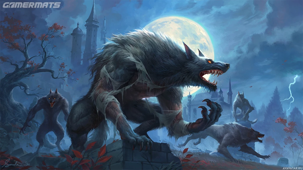 an aggressive stance, with their wolf forms prominently displayed. They are set against a backdrop of