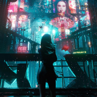 short hair. In the background, there are illuminated advertisements and brightly lit buildings, contributing to the urban and neon-lit