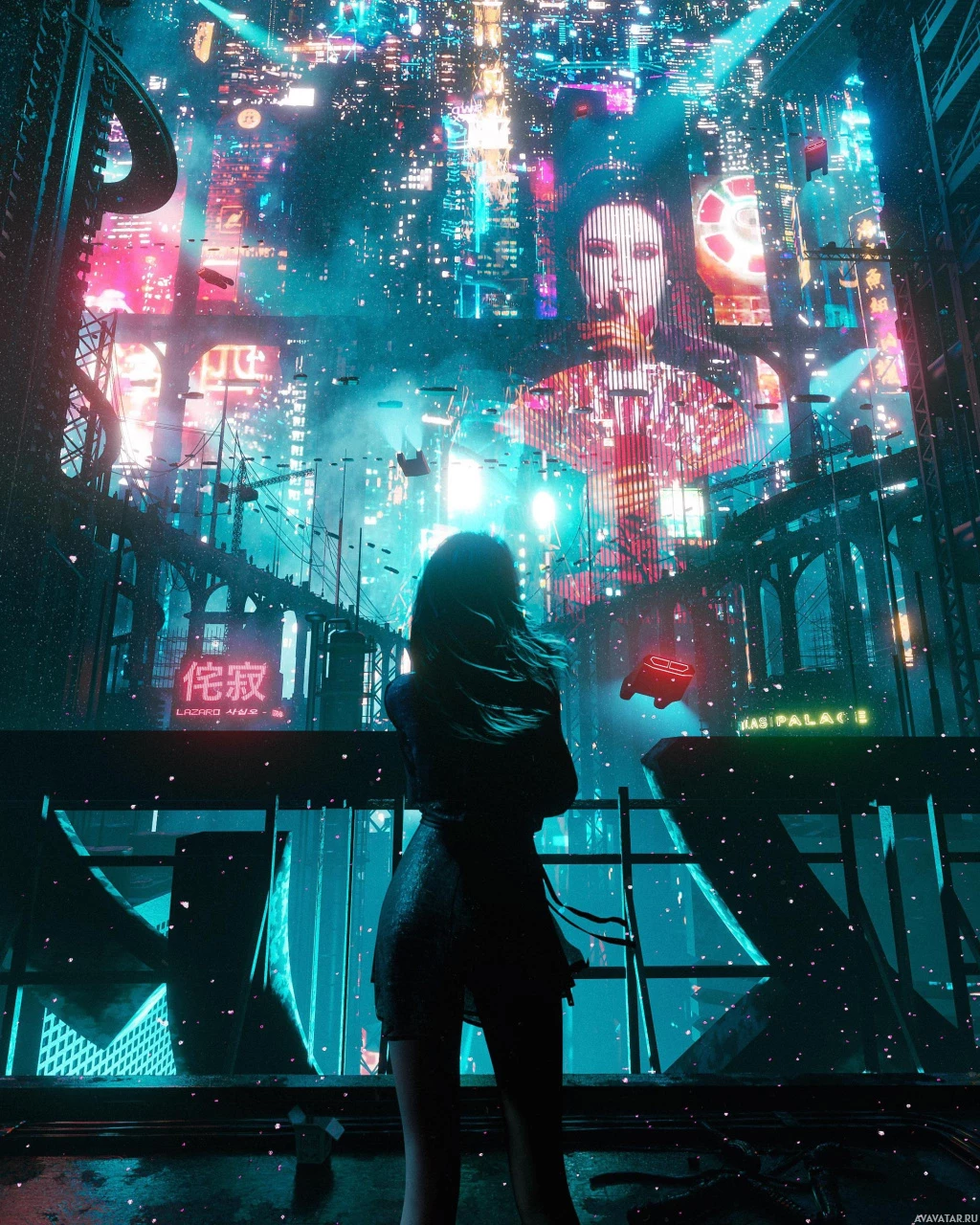 atmosphere of the setting. The overall mood of the picture suggests a futuristic or cyberpunk theme.