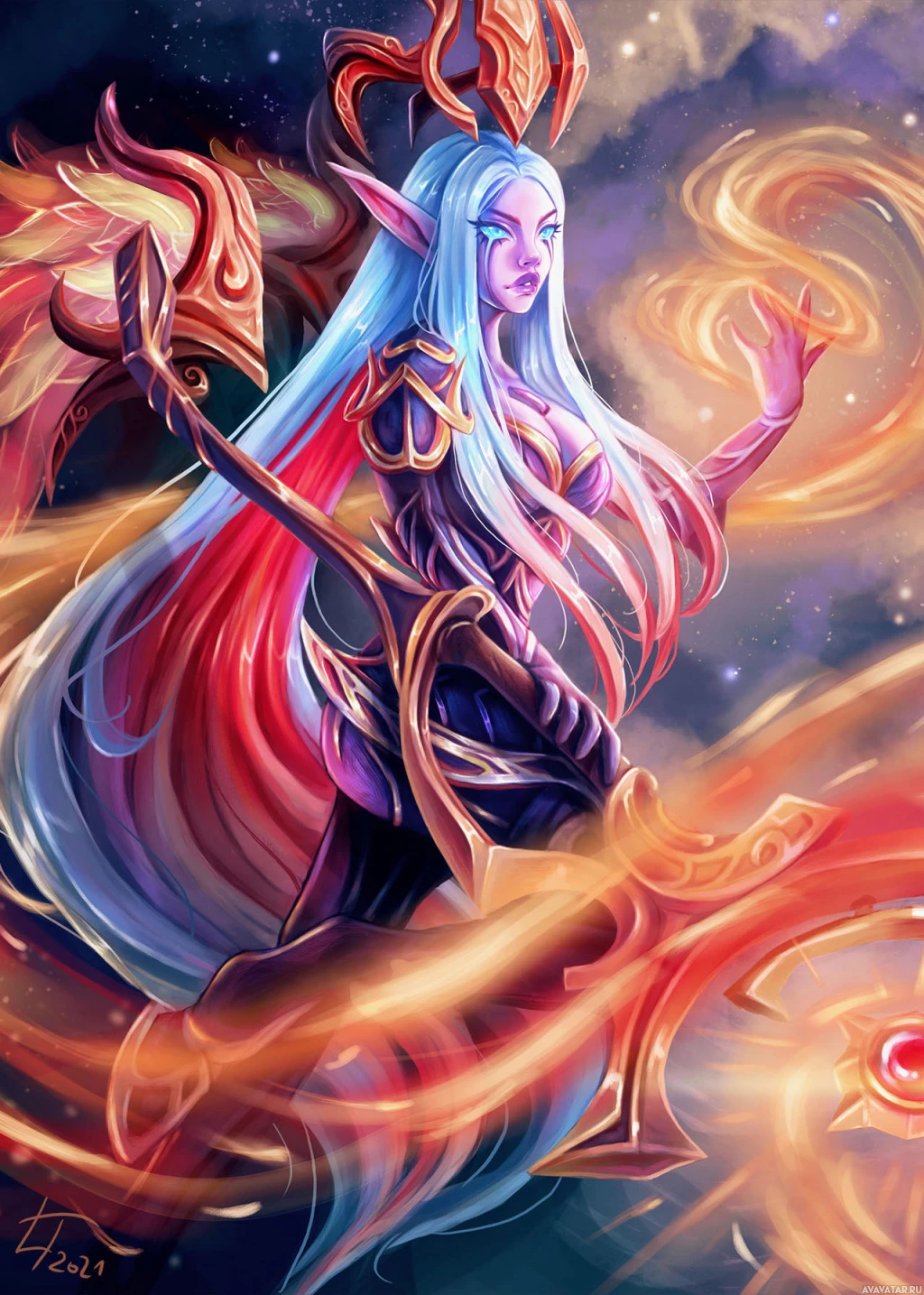 a female figure with pointed ears, wearing an armor and holding what looks like magical staffs or weapons. She has long flowing hair in shades of blue and white, and her eyes have a glowing effect, suggesting she might possess some sort of
