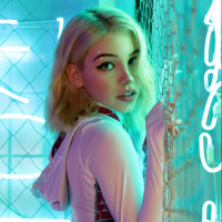 neon lights, which adds to the colorful and vibrant atmosphere typical of cosplay events or photoshoots. The person is posing in front of this backdrop, highlighting their costume and the theme they are portraying.