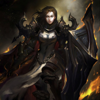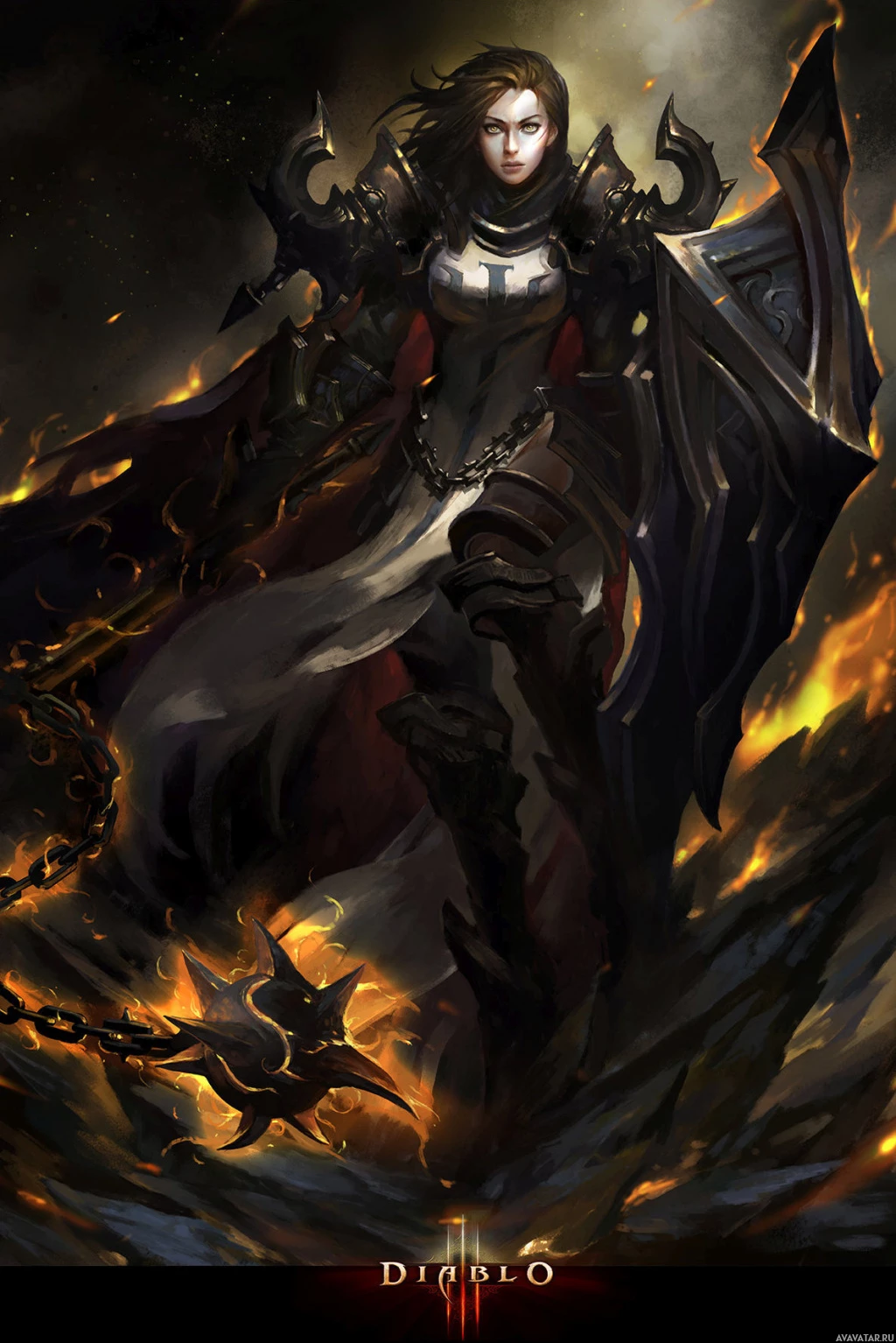 various spikes and chains, suggesting she may be of a dark or evil faction. Her attire includes a cape, a skirt, and boots that seem to be designed for combat. The background features flames and