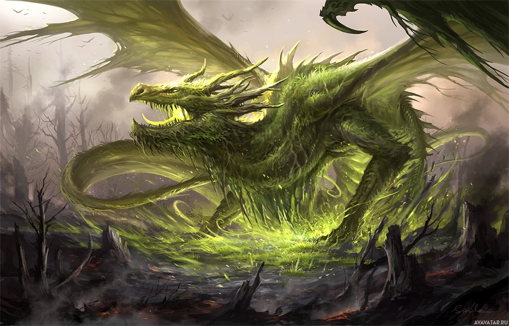 The image shows a fantasy-themed illustration of a dragon. The dragon is depicted in a dynamic and somewhat ominous pose, with its wings spread wide and its mouth open as if roaring or breathing fire. It has green scales and is set against a dark,