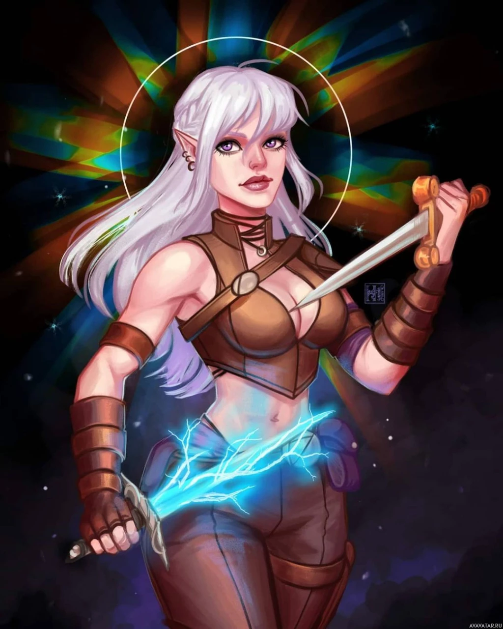 white hair and is dressed in armor, suggesting she might be a warrior or adventurer. She's wielding a sword in one hand and what seems to be a staff or wand in the other. Her outfit includes a corset and shorts, giving her an athletic look, which is common for
