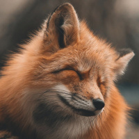 На снимке изображена рыжая лиса с закрытыми глазами, выглядящая довольной. Пушистая шубка позволяет предположить, что на улице, возможно, похолодало. Фон размыт, но выглядит естественно и безмятежно, возможно, на природе, например, в лесу или поле.