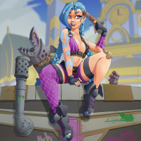 white hair with purple streaks, and is wearing her signature outfit which includes a purple tank top, black pants, knee-high socks, and knee-length boots. The character is also holding a gun in one hand and smoking a cigarette. Jinx is sitting on a crate with some