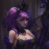 На картинке изображен анимационный персонаж с фиолетовыми волосами, одетый в костюм в стиле фэнтези, который включает в себя темную одежду с перьями и нечто похожее на корону или головной убор. У нее серьезное выражение лица, и она сидит в позе, которая наводит на мысль, что она вовлечена в какое-то действие или ролевую игру.