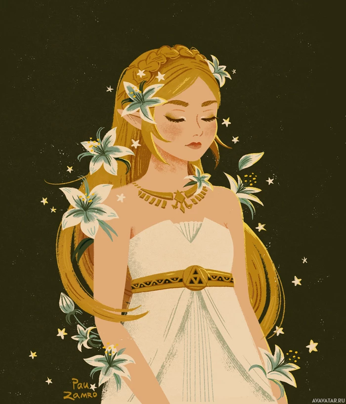 blonde hair and is wearing what appears to be a white dress with some golden ornamentation around her neck. Surrounding her are