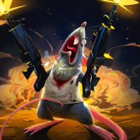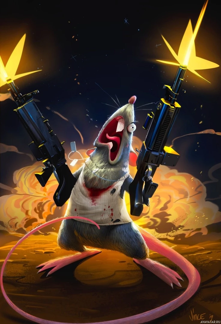 The image features an animated mouse or rat character standing upright and holding a gun in each hand. There is
