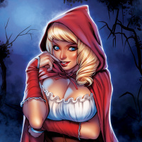 high socks or stockings with garters, which suggest a more eroticized interpretation of the character. The background is dark and moody, fitting the nighttime scene often associated with Little Red Riding Hood's journey through the forest in the classic tale.