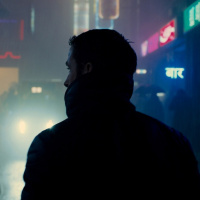 nighttime setting. They are positioned on either side of the frame, suggesting a dual perspective or representation. The background is illuminated by artificial lights and shows signs and advertisements typical of a bustling