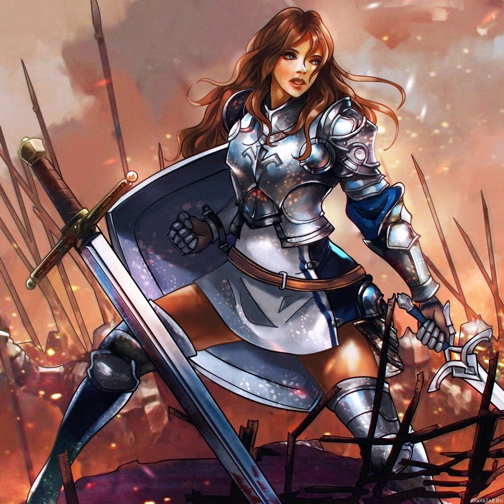 На картинке изображена рыжеволосая женщина-воин в доспехах и с мечом в руках. Судя по ее динамичной позе и окружающему хаосу, она находится в гуще битвы или готовится к ней.