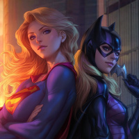 На картинке изображены две героини, одна в костюме Супергерл, а другая в костюме Кэт Нуар из мультсериала "Девочки-супергероини DC". Они стоят бок о бок на фоне городского пейзажа.