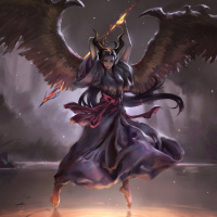 the fantastical nature of the image. They are holding what appears to be a staff or weapon that resembles a spear or sword. The overall composition is dynamic with a sense of movement suggested by