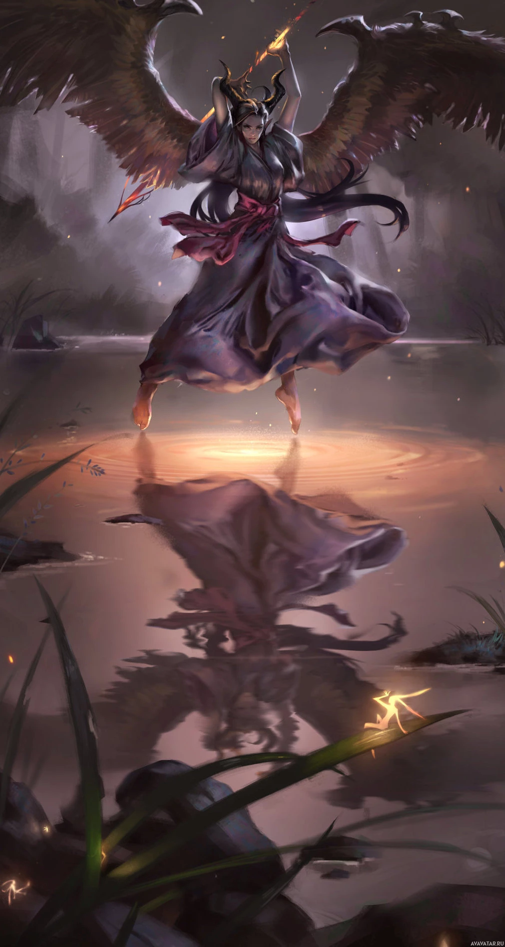 a body of water, given the reflections and the misty atmosphere. The character is wearing armor and has wings, which adds to