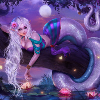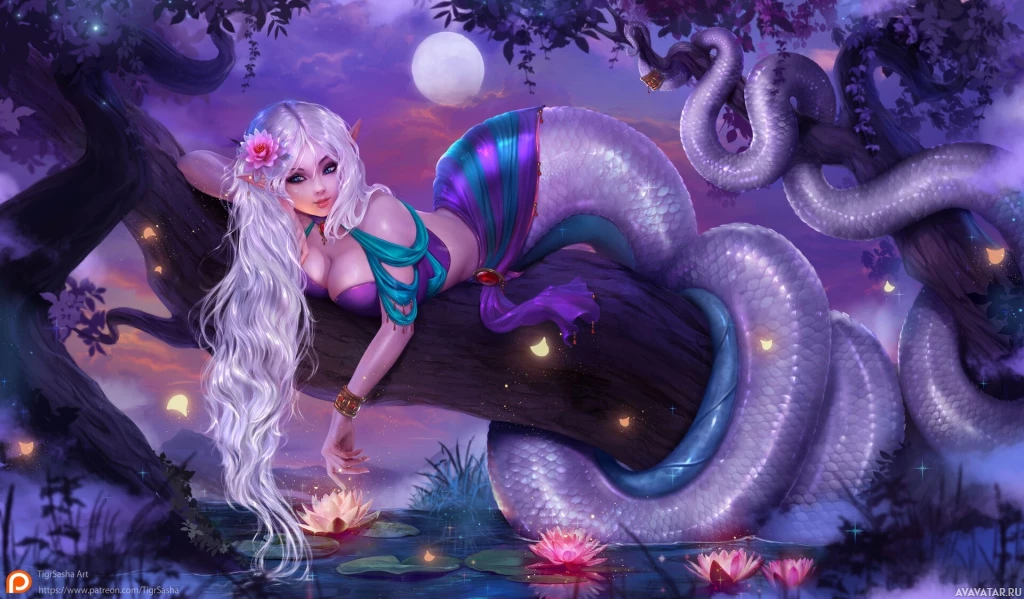 white hair and a naga form. This creature is often associated with mythology and legends, usually taking the form of a serpent or dragon in human