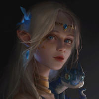 an elven character. She has pale skin, pointed ears indicative of her elf nature, and striking