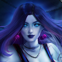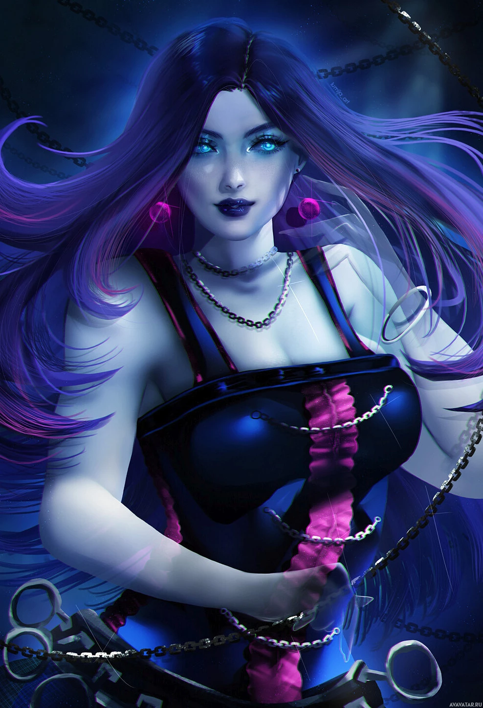 blue hair and a dark, moody aesthetic. She appears to be wearing a top with chains or straps on it, which adds to the gothic or cyberpunk vibe of her outfit. Her expression is intense and focused, which might suggest she is in the middle of an action sequence or a moment of