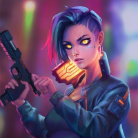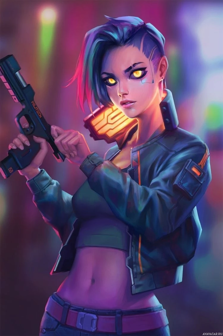 a glowing object that could be interpreted as a futuristic device or weapon in the other. The background suggests a neon-lit