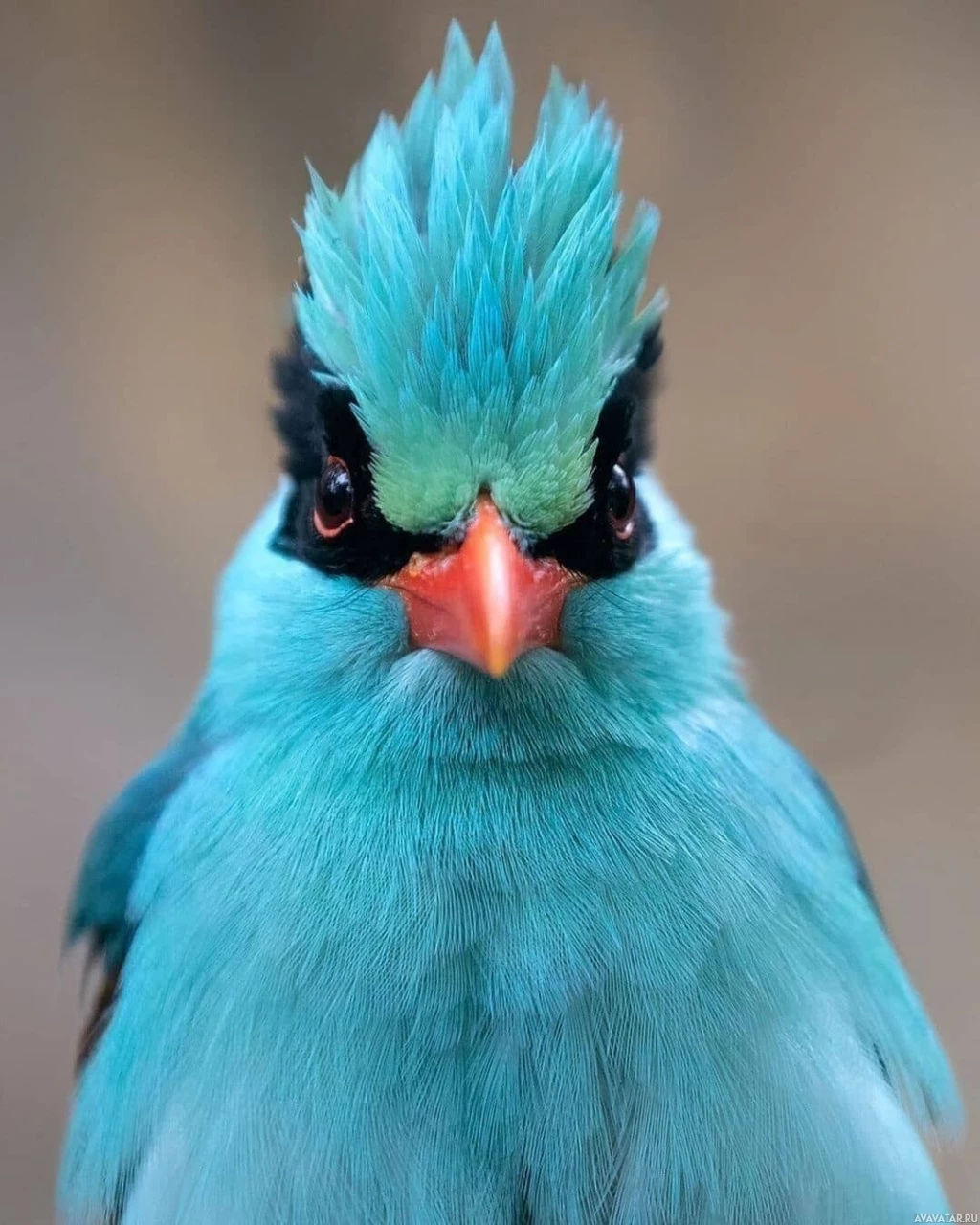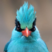 На картинке изображена синяя птица, вероятно, самец, поскольку голова и грудка у него ярко окрашены. На голове у птицы заметный гребень, характерный для этого вида. Кажется, что она смотрит прямо в камеру сосредоточенным взглядом.