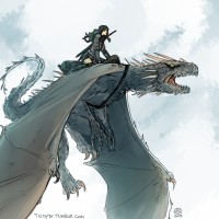 dark hair and is wearing what appears to be armor, suggesting she may be a warrior or adventurer. The dragon is large and detailed, with scales and horns that indicate it's meant to represent